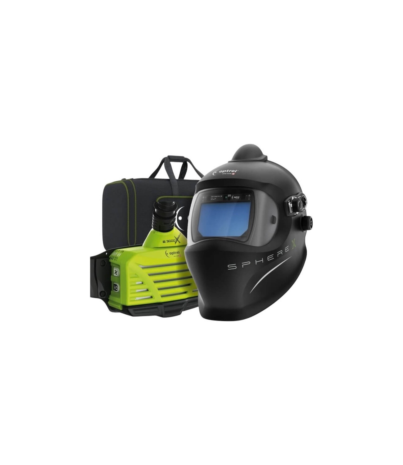 Pack Optrel avec cagoule sphereX CLT et système ventilé e3000X pour souder avec air filtré en environnement chargé.