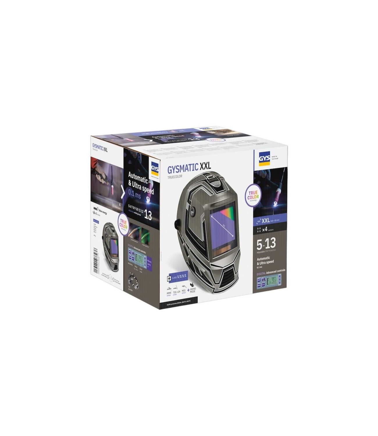 La GYS GYSMATIC XXL 5-13G TRUE COLOR est une cagoule de soudure professionnelle à filtre auto-obscurcissant offrant une plage de teinte 5 à 13. Sa technologie TRUE COLOR restitue les couleurs naturelles du bain de fusion pour plus de précision et de confort visuel. Son champ de vision XXL, son serre-tête ergonomique et son mode meulage intégré en font un choix idéal pour les soudures MIG, TIG et MMA intensives.