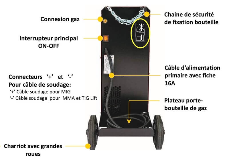 - 82A en courant de soudage pour 6min (60%) de fonctionnement et 4min de refroidissement.