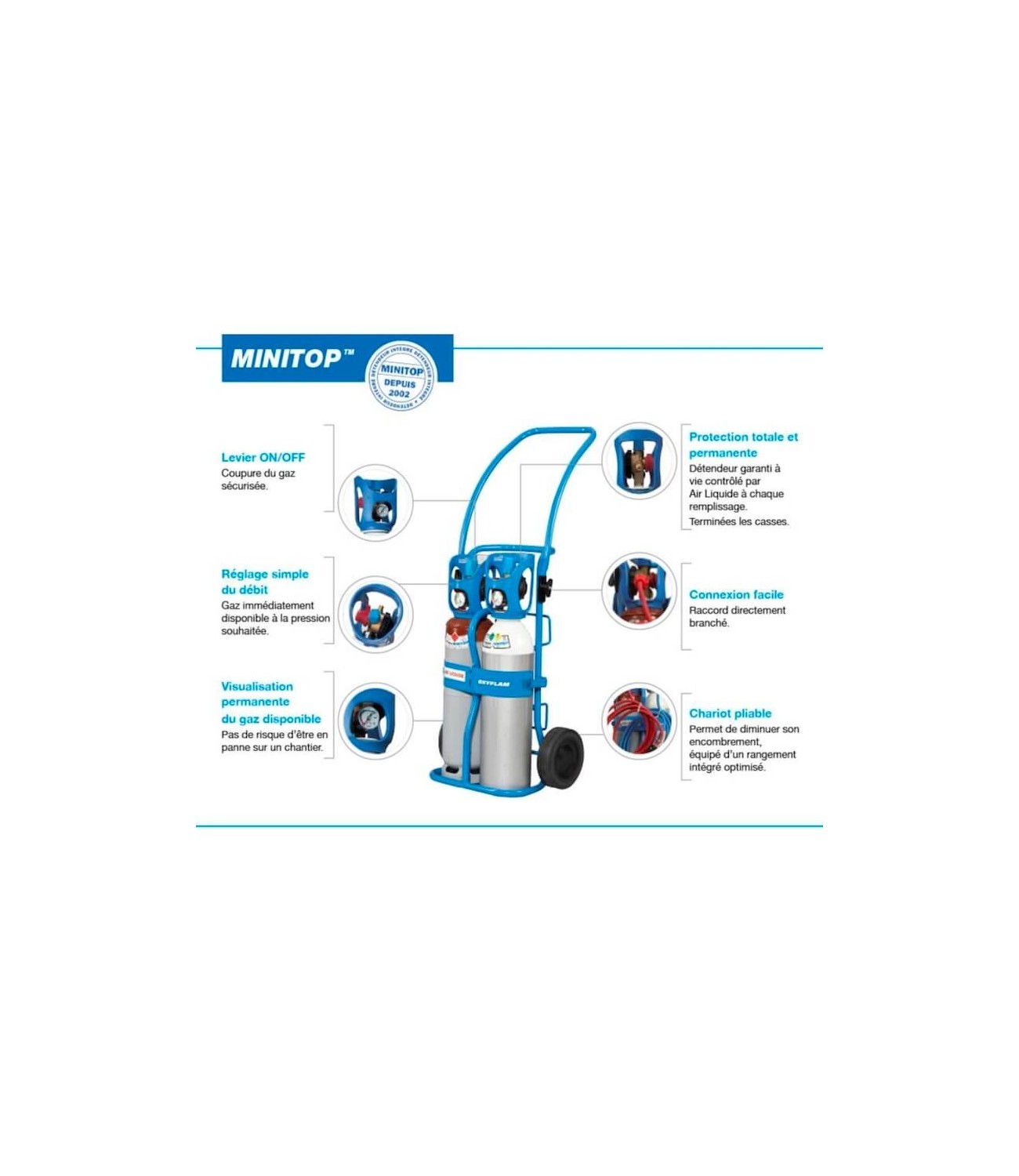 MINITOP est le premier poste de soudage oxy-acétylènique équipé de bouteilles oxygène (1 m³) et acétylène (0,8 m³) munies d’un robinet détendeur intégré.