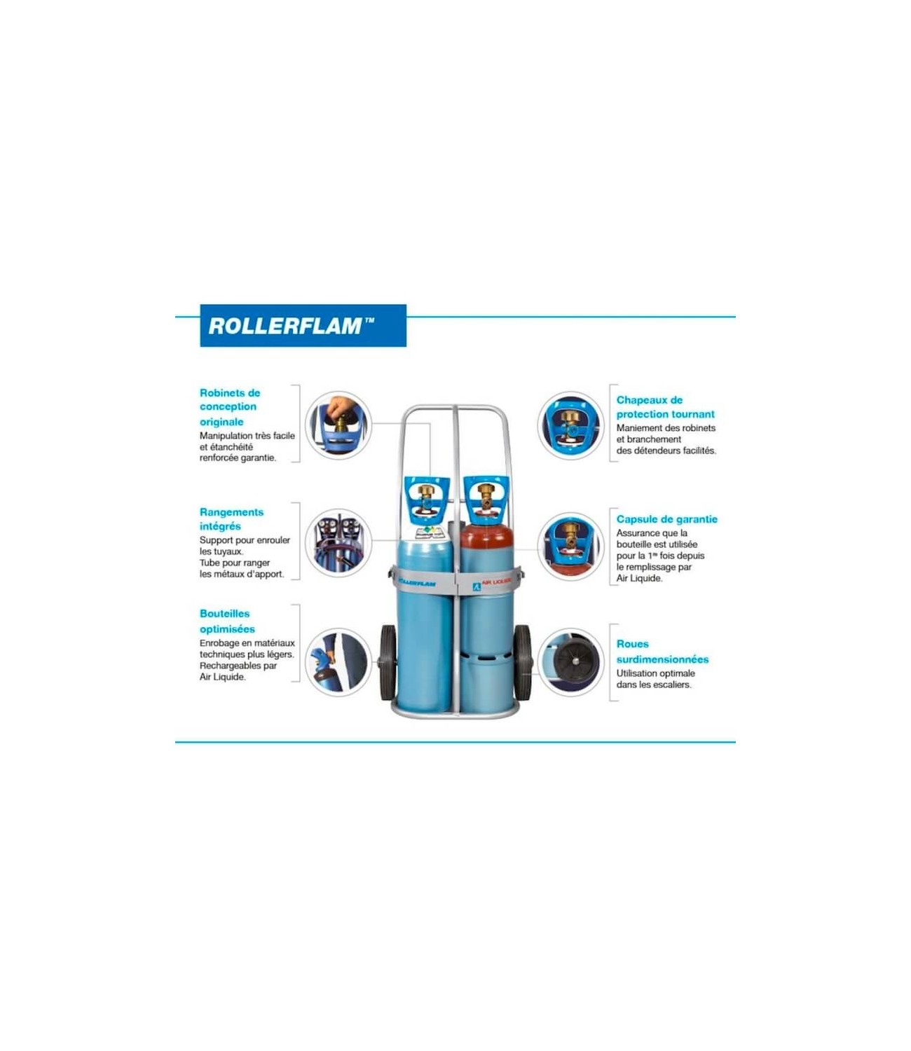Rollerflam est un poste de soudage oxy-acétylène mobile. Ce nouveau chariot Rollerflam d’Air Liquide est équipé d’une bouteille d’oxygène S11 de 2,3m3 et d’une bouteille d’acétylène S11 de 1,4 m3. Le poids des bouteilles a été réduit en utilisant un alliage léger (39 kg).